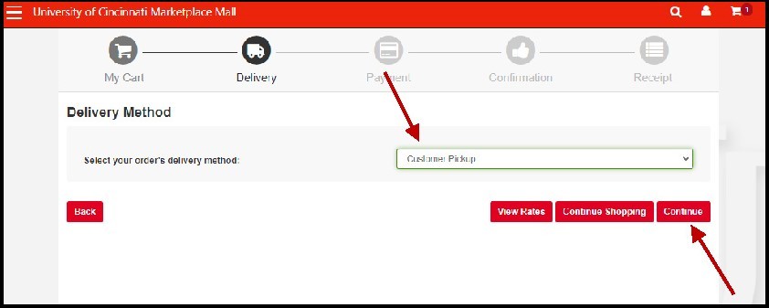 For Delivery Method, please select Customer Pickup, then click Continue. If your order is scheduled for delivery, it will still be delivered.
