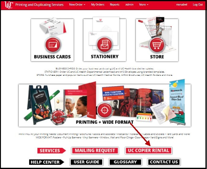 - You can select the appropriate option from the New Order menu in the red header bar. Note that Printing and Wide Format categories are grouped together under the Printing Order option, as shown on the corresponding button. The UC Copier Rental option will take you to the form to submit a request for a departmental copier/printer.