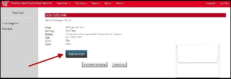 You will be returned to the General Store page. Scroll to the bottom of the page to find the available envelopes. Let’s add a box of the Blank A2 envelopes to our cart by clicking that icon.