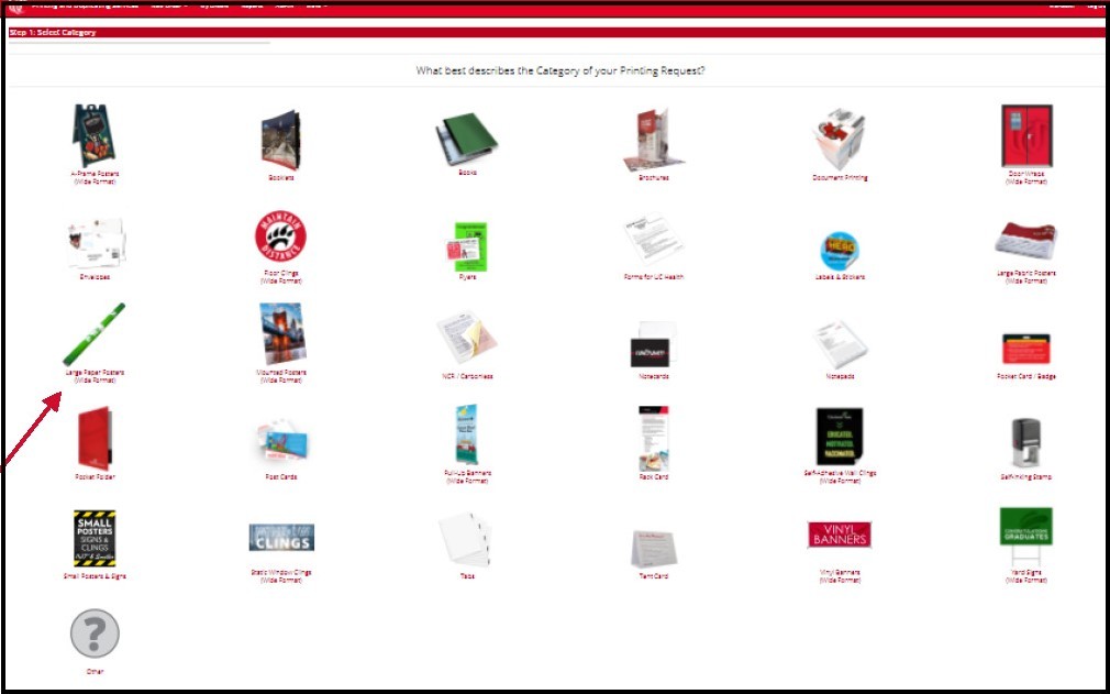 All Wide Format categories are marked as such on the second line of text. Find the icon for the category you need to order. For this example, let’s order a large paper poster, so click that icon. We’ll also request laminate for this as an extra learning opportunity.