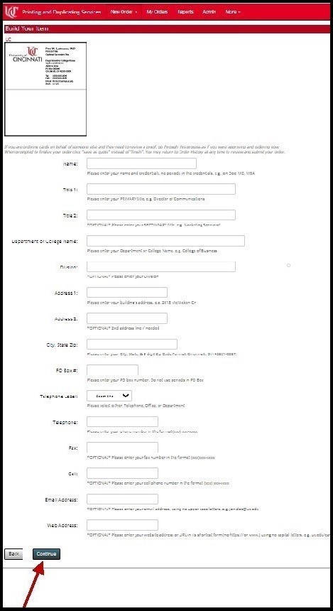 Note that some fields are designated as *OPTIONAL* (below the text entry box). All other fields must be filled in to proceed to the next step. When all fields are completed, click Continue.
