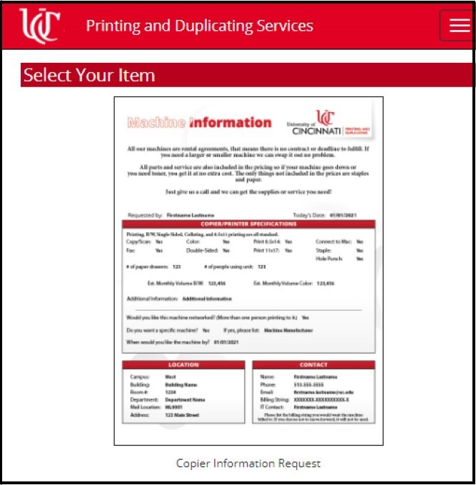 We also offer copiers and printers for your office as rentals. To request information, click UC Copier Rental in the Services area of our Print Order Desk home page.