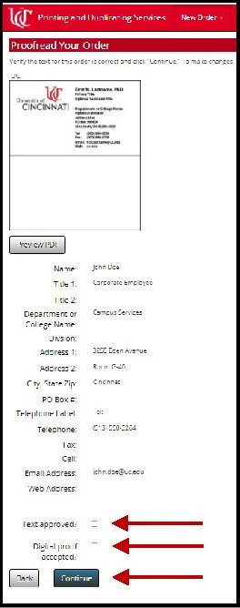 The window will close and you will be asked to approve the Text and the Digital proof. Check both boxes and click Continue.